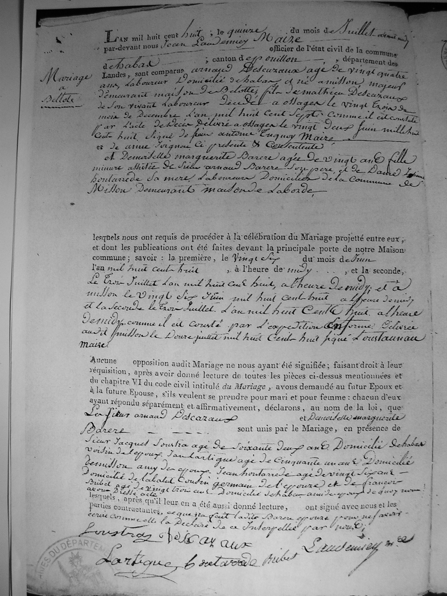 Acte de mariage de Arnaud Descazaux et de Marguerite Barere