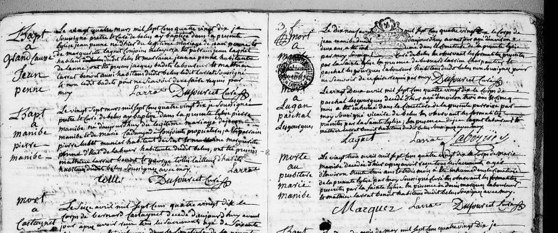 Acte de décés de Jean et Marie Manibe et baptème de Pierre Manibe