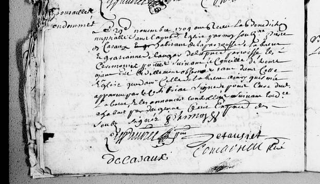 Acte de mariage de Pierre De Cazaux et de Gratianne de Lauga