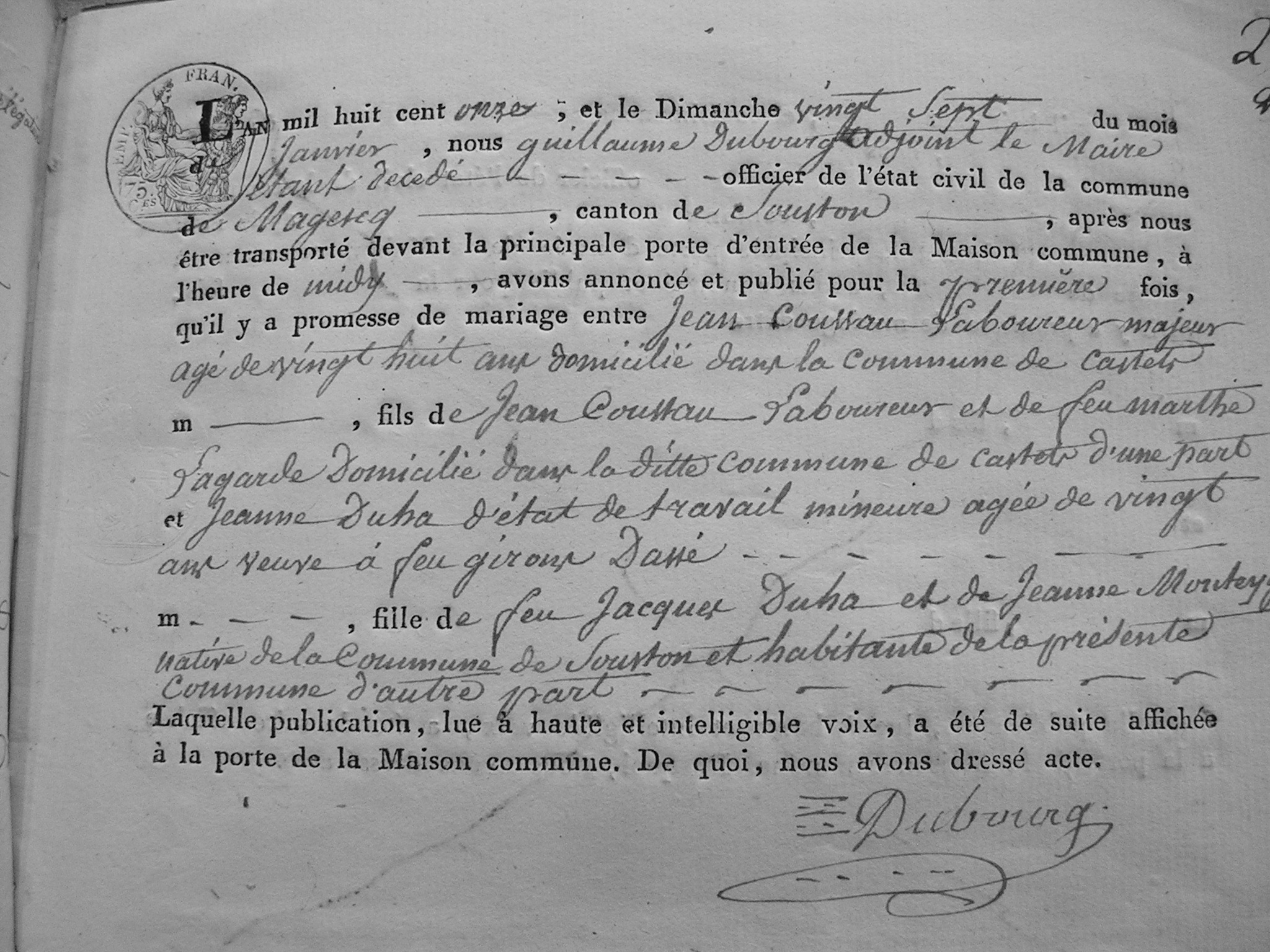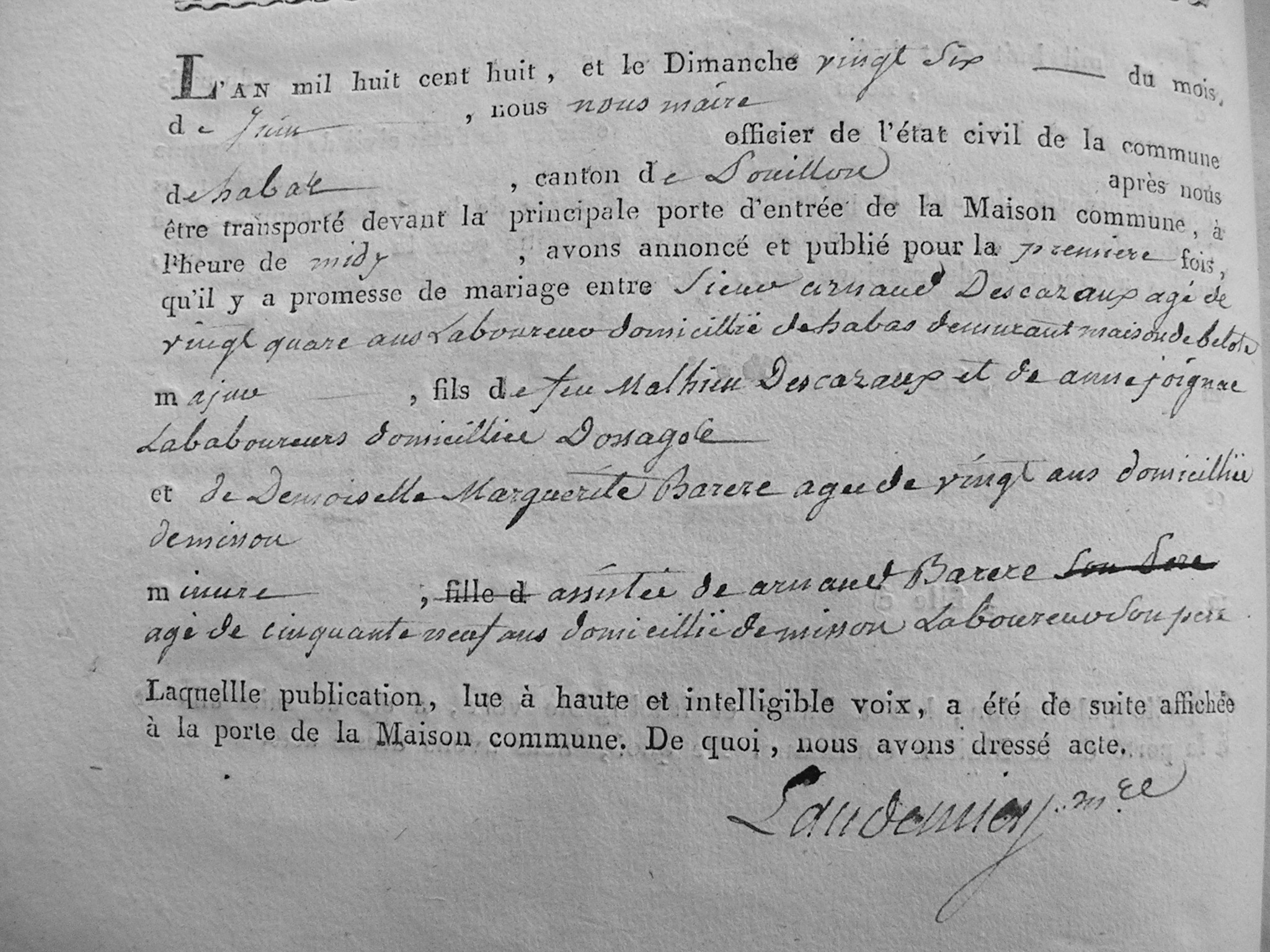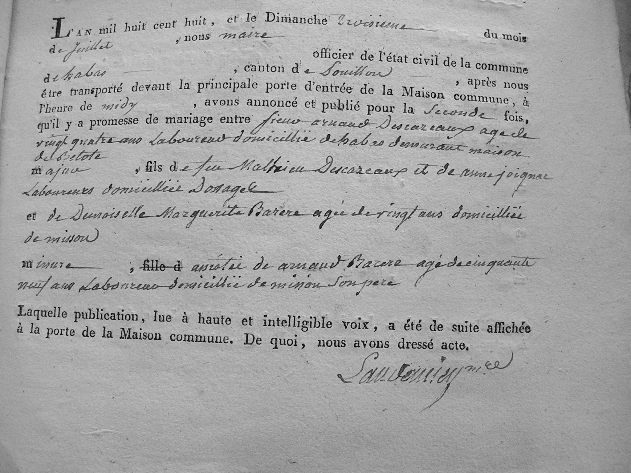1ere promesse de mariage de Arnaud Descazaux et de Marguerite Barere